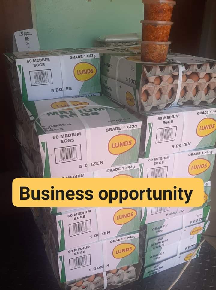 Business opportunity for anyone interested in distributing/selling eggs. We deliver you a minimum of Twenty (20) boxes of 5 DOZEN medium Eggs then you sell each 5 Dozen Eggs at R120, month-end YOU EARN A BASIC SALARY OF R1500,00 and 20% commission from the profit made, from the Street Market. We supply you with stock (we don't want you to go a day by without eggs (stock), we make sure you always have stock). TO JOIN! Pay commitment fee of R750 for speed point machines (NON REFUNDABLE).